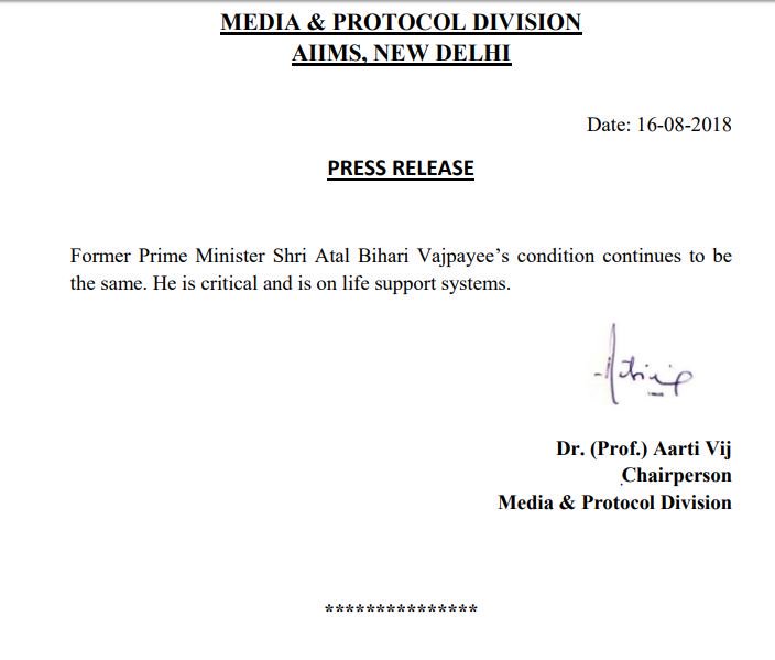 AIIMS के तरफ से जारी की गई हेल्थ बुलेटिन, अटल बिहारी वाजपेयी हालत में कोई सुधार नहीं